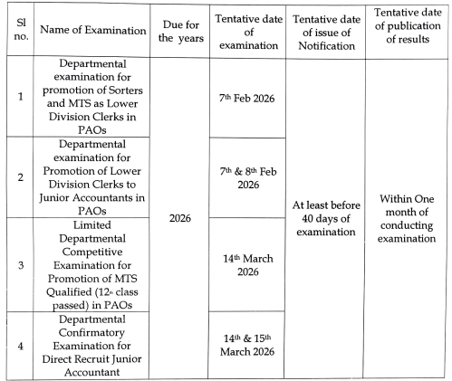 Please find enclosed Calendar of Departmental Examinations pertaining to Postal Accounts offices (Annexure-A) to be held in the year 2026.